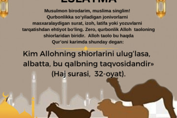 #Zulhijja#Arafa#Qurbonlik#ESLATMAQurbonlik kunlari yaqinlashib kelayotgani munosabati bilan ESLATMA! Musulmon birodarim, muslima singlim! Qurbonlikka so‘yiladigan jonivorlarni masxaralaydigan surat, izoh, latifa yoki yozuvlarni tarqatishdan ehtiyot bo‘ling. Zero, qurbonlik Alloh taoloning shiorlaridan biridir. Alloh...