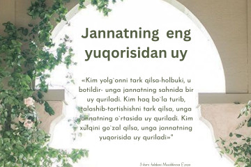 Anas roziyallohu anhudan rivoyat qilinadi: «Nabiy sollallohu alayhi vasallam: «Kim yolg`onni tark qilsa-holbuki, u botildir- unga jannatning sahnida bir uy quriladi. Kim haq bo`la turib, talashib-tortishishni tark qilsa, unga jannatning...