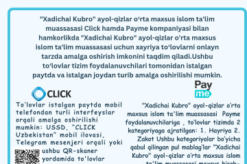 Endilikda "Xadichai Kubro" ayol-qizlar o’rta maxsus islom ta’lim muassasasida tahsil olayotgan talabalarga hamda madsara faoliyatiga moddiy yordam berishni uydan chiqmasdan qo'l telefoningiz orqali amalga oshirishingiz mumkin."Xadichai Kubro" ayol-qizlar o‘rta maxsus...