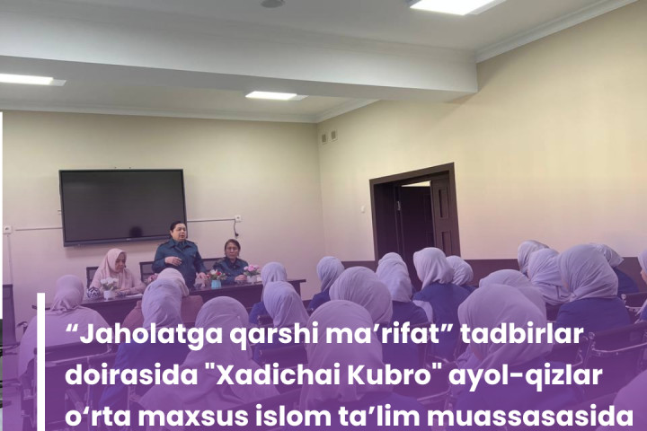 Joriy yilning 25 oktyabr kuni “Jaholatga qarshi ma’rifat” tadbirlar doirasida "Xadichai Kubro" ayol-qizlar o‘rta maxsus islom ta’lim muassasasida talaba qizlar bilan soha mutaxassislari bilan suhbat uchrashuv bo‘lib o‘tdi. Ushbu uchrashuvda Olmazor tumani 2-IIB XPB XQMB podpolkovnik Sh.X.Mirzakarimova, podpolkovnik G.A.Taymuratovalar qatnashishdi.