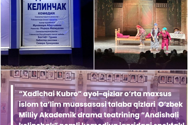 “Xadichai Kubro” ayol-qizlar o‘rta maxsus islom ta’lim muassasasi talaba qizlari O‘zbek Milliy Akademik drama teatrining “Andishali kelinchak” nomli komediya janridagi spektakl namoyishida ishtirok etdi