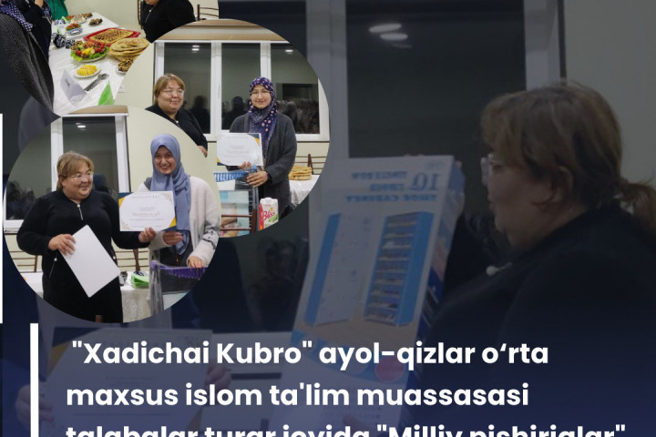 13-noyabr kuni "Xadichai Kubro" ayol-qizlar o'rta maxsus islom ta’lim muassassasi talabalar turar joyida istiqomat qiluvchi talaba qizlar o’rtasida “Milliy pishiriqlar” nomi ostida don-un mahsulotlaridan shirinliklar tayyorlash musobaqasi o‘tkazildi.
