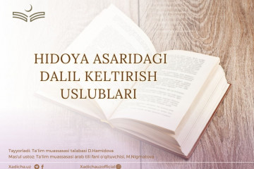 Hidoya asaridagi dalil keltirish uslublari“Hidoya” asarini mutolaa qilgan kishi biror fiqhiy masalaga Imom Marg‘inoniy boshqa faqihlar kabi Qur’oni Karim, sunnat, sahobalarning osorlari, ijmo, qiyos, istehson kabi bir nechta dalillar keltirganining...