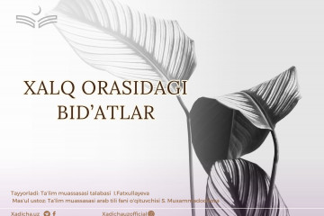 Xalq orasidagi bid’atlarInsonga uning bilmagan narsasini oʻrgatib, musaffo aqidaga yoʻllagan Alloh taologa hamdu sanolar boʻlsin. Bu musaffo aqidani bizlarga mukammal holda yetkazgan paygʻambarimiz Muhammad Mustafoga hamda u zotning ahli oilalariga...