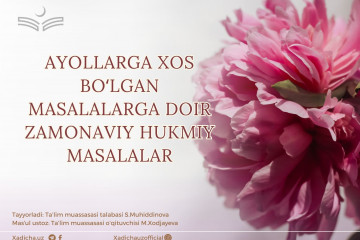 Ayollarga xos boʻlgan masalalarga doir zamonaviy hukmiy masalalarShuning uchun ham Islomda tashqi ko‘rinishga ahamiyat berishga ruxsat etilgan. Bunda ziynatlanishni harom qiladigan holatlar quyidagilardir:a) kofir yoki axloqsiz odamlarga o‘xshash uchun qilinsa;b)...